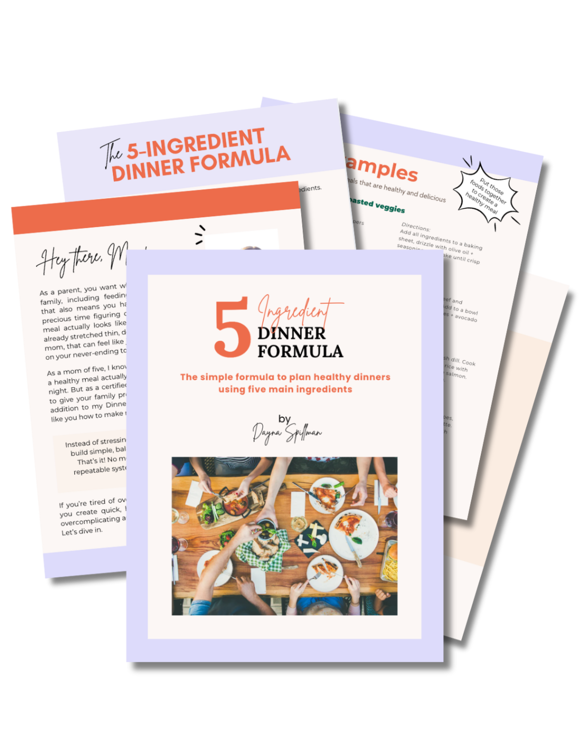 The 5-Ingredient Dinner Formula is a repeatable process to make balanced meals for your family every night. No saving hundreds of recipes you'll never use or spiraling over what's considered "healthy" this week on social media.